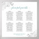 Ce tableau de 6 places est à la fois simple et élégant avec du texte gris foncé et turquoise ou turquoise sur un arrière - plan blanc et un faux feutre argenté en dentelle dans les coins. Le titre dit "s'il vous plaît trouvez votre table" dans une élégante calligraphie de script. Sophistiqué et chic. Comprend l'assignation de table pour 60 personnes avec 10 sièges par table.