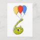A birthday monster in the shape of a number 6. This character is in green and blue, and he has three colourful birthday balloons.