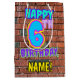 The front of this fun birthday gift bag design features the message “HAPPY 6TH BIRTHDAY,” having a colourful, vibrant, graffiti and urban street art inspired appearance, along with a custom recipient name. The background features a pattern inspired by the look of a brick wall. A birthday themed gift bag like this might be a fun way to wrap a gift or present being given to celebrate somebody’s sixth birthday. [~Z0000536]