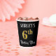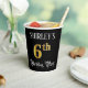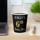 This elegant and fancy birthday paper cup design features a customizable name and the message “6th Birthday Party”. The large number “6th” has an imitation/faux gold-inspired colouring pattern, the words “Birthday Party” are in luxurious script-style text, and the background is coloured black by default (although it can be customized). Luxurious, ornate paper cups like this might be used at a birthday celebration being held in celebration of somebody’s sixth birthday. [~Z0000567]