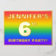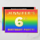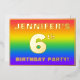 The front of this joyful sixth birthday party foil invitation card design features a personalized name, a large number “6th”, the message “BIRTHDAY PARTY!”, and a border. The background of the front has a vibrant, multicolored, rainbow spectrum inspired gradient pattern. The back features personalized details about the event, such as the date, time, venue/place, and any other information that may be useful. Personalized invitations like these might be a fun way to invite attendees to a birthday gathering/party being held in celebration of somebody’s 6th birthday. [~Z0000599]