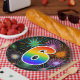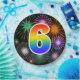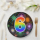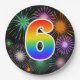 This fun, cheerful, and colourful paper plate design features a large number "6" coloured with a rainbow spectrum gradient inspired pattern. It also features a exciting and vibrant bursting celebratory fireworks inspired pattern. It has a black coloured background. Fun paper plates like this might be used at somebody’s 6th birthday party, a sixth anniversary celebration, or some other sixth event. [~Z0000490]