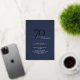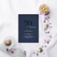 This beautiful invitation features hand lettered calligraphy artfully presenting 'seventy' in luxurious hand lettering against a blue background, adorned with delicate swirls in the corners top and bottom in real gold foil, along with the name and the number 70. This image will have all your guests excitedly anticipating your fabulous seventieth festivities!
