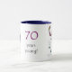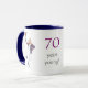 This white ringer mug, with dark blue lip and handle makes a great birthday gift for a 70 year old! The image, back and front is of an 'older man' dancing, in a blazer and boater hat, from a watercolour illustration by Judy Adamson. Between the two men is the text - 70 years young!