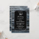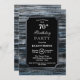 Une invitation rustique bordée d'argent en bois de grange bleu 70ème anniversaire avec le texte blanc mis en surbrillance sur un arrière - plan noir.