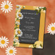This bold wedding invitation features white retro daisy flowers on a deep black onyx background, framed by a burnt terracotta-orange border. The playful yet elegant floral design brings together groovy 70s energy with a modern boho twist – perfect for free-spirited couples with a love for bold contrast and vintage charm.