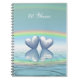 Notebook with my original design of two platinum hearts floating on the water under a rainbow. Customizable text says "70 Years".