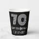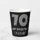 This vintage style and Roaring Twenties inspired birthday-themed paper cup design features a large art deco inspired style number “70”, along with the birthday greeting message “Happy 70th Birthday,” and an editable name. The background is coloured black. Roaring Twenties inspired birthday themed paper cups like this might be used at a party for somebody who is celebrating their seventieth birthday. [~Z0000542]
