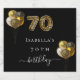 For an elegant 70th birthday party. A black background, decorated with balloons. Number 70 is written with a trendy balloon style font, leopard print. Personalize and add a name and a date. The word birthday is written with a modern hand lettered style script with swashes.