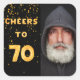 A trendy 70th birthday party sticker. With the text: Cheers to 70 on front written with faux gold balloon letters. Black background with golden confetti. Template for your photo.