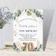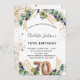 For a 70th birthday party. A white background decorated with eucalyptus greenery and golden leaves. Golden faux glitter spots. Personalize and add your names and wedding details. Black and golden coloured letters. Number 70 is written with balloon style font.