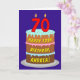 This joyful and fun birthday-themed greeting card design features a depiction of a three-tier birthday cake having numeral-shaped candles on top showing the number “70“, along with the message “HAPPY 70TH BIRTHDAY,”, and an editable recipient name. The inside features a custom birthday greeting message, or could perhaps be cleared and left blank if a message is to be written by hand instead. A cheerful, personalized birthday greeting card like this might be used to celebrate somebody’s seventieth birthday. [~Z0000620]