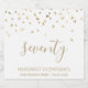 Help her celebrate her 70th birthday in style with this simple but elegant design, featuring faux gold foil triangular confetti sifting down on the word "seventy" in gold handwriting font on a white background. Personalize it with the name of the honoree in gold sans serif font, along with the occasion and date below in smaller gold type.