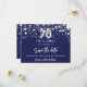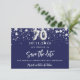 An elegant Save the Date card for a 70th birthday party. A navy blue decorated with stars. Personalize and add a date and name/age. The text: Save the Date is written with a large trendy hand lettered style script.