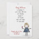 Cute stick party girl in sneakers and blue denim jean dress with red wine, pearl necklace, hair on soft white background for a 70th birthday party.