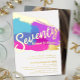 Bold abstract art brush strokes in bright pink, purple and blue with gold foil or your own foil colour photo template 70th birthday party invitation. Personalize this seventy gold script art milestone birthday invitation with your own birthday party event details, and a photos of your birthday girl on the reverse. Other years colours and matching items are available. © Original design by Sarah Trett for www.mylittleeden.com on Zazzle.