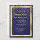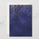 A festive and elegant 70th birthday party invitation card. A dark midnight blue background colour and a faux gold frame. With a golden confetti rain. Templates for your party information, golden letters. The blue colour is uneven.