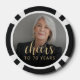 These custom 70th birthday poker chips feature the guest of honour's photo, along with the word "Cheers" in elegant gold-coloured calligraphy script. A dark screen helps make the text pop. A great way to celebrate someone who's turning seventy!