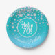 An elegant and glamourous paper plate for a 70th birthday party for a girl. A chic teal, green and light blue ombre faux glitter coloured background. A teal coloured circle with modern hand lettered style text: Hello 70! Faux diamonds as decoration. Template for a name and a date, curved text.