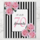 A wine label for a 70th birthday party. Classic slim black and white vertical stripes as background. With girly and feminine pink roses as decoration.