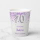 For a glamourous and feminine for a 70th birthday party. A faux silver looking background. On the front and the back: Personalize and add a name and a date. Decorated with purple faux glitter dust. Number 70 is written with a balloon style font.