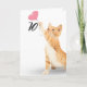 Gold tabby cat with pink heart balloon for 70th birthday on white background.