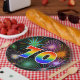 This fun, cheerful, and colourful paper plate design features a large number "70" containing a rainbow spectrum gradient inspired pattern colouring. It also features a vibrant and exciting bursting celebratory fireworks inspired pattern. It has a black coloured background. Fun paper plates like this might be used at a celebration being held to observe somebody’s 70th birthday, a 70th anniversary, or some other seventieth event. [~Z0000490]