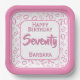 This over-the-hill design has a pink and white random number pattern with milestone number 70 repeated in varied sizes and angles. There is a white rounded square in the centre for your text and pink and white around the rim.