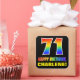 This colourful, cheerful, and fun birthday sticker design features a large number "71" and the message "HAPPY BIRTHDAY,", both coloured with a rainbow spectrum gradient inspired pattern, along with a bold yellow editable name. The background is coloured black. Fun stickers like this might be used when wrapping gifts being given to somebody in celebration of their seventy first birthday, or perhaps maybe be given out to the attendees at a birthday celebration or party. [~Z0000480]