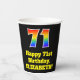 This exciting and fun birthday-themed paper cup design features a large number “71” with a rainbow spectrum gradient inspired pattern, along with the message “Happy 71st Birthday,”, and a personalized name. The background is coloured black. Colourful, vibrant paper cups like this might be fun to have at a birthday celebration being held to honour somebody’s seventy first birthday. [~Z0000537]
