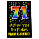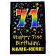This colourful, vibrant, and exciting birthday-themed gift bag design features a large number "71" with a rainbow spectrum gradient style pattern, along with the message "Happy 71st Birthday,", and a personalized recipient name. It also has a background pattern featuring star shapes of various sizes and colours. A birthday themed gift bag like this might be a fun way to wrap a gift or present being given to somebody who is celebrating their seventy first birthday. [~Z0000510]