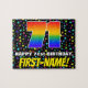 This cheerful and exciting birthday themed jigsaw puzzle design features a large number “71” with a multicolored rainbow spectrum inspired gradient pattern, along with the message “HAPPY 71st BIRTHDAY,”, and a custom recipient name. The background has an eye-catching, multicolored star field pattern. A fun, personalized birthday puzzle like this might be given in celebration of somebody’s seventy-first birthday. [~Z0000607]