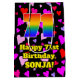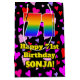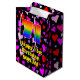 This cheerful and colourful birthday themed gift bag design features a large number “71” with a rainbow spectrum gradient inspired pattern, along with the message “Happy 71st Birthday,”, and a personalized name. The background features a pattern of heart shapes with colours like red, purple, and pink. A gift bag like this might be a fun way of wrapping a birthday present or gift being given to somebody who is celebrating their 71st birthday. [~Z0000551]