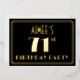 The front of this vintage-appearance and Roaring Twenties inspired seventy-first birthday party foil invitation features a personalized name, a large art deco look inspired number “71st”, the message “BIRTHDAY PARTY”, and a border pattern consisting of lines. The front also has a black-coloured background by default, but it can be customized to a different colour if desired. The back features personalized details about the event, such as the date, time, venue, and any other important information. Elegant, luxurious, editable invitations like these might be used to invite guests to a birthday gathering being held in celebration of somebody’s 71st birthday. [~Z0000591]