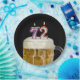 Lit birthday candles in mug of beer on black for 72nd birthday.