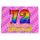 This cheerful and festive 72nd birthday-themed gift bag design features a large number "72" having a pattern inspired by the look of a rainbow spectrum. It also features the message "Happy 72nd Birthday,", followed by a customizable name. The background features a light pink and dark pink stripes pattern containing loving pink heart shapes. Gift bags like this might be used when wrapping presents or gifts being given to somebody who is celebrating their seventy second birthday. [~Z0000414]
