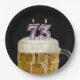 Lit birthday candles in mug of beer on black for 73rd birthday.