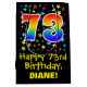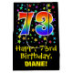 This colourful, exciting, and fun birthday-themed giftbag design features a large number "73" with a rainbow spectrum gradient inspired pattern, along with the message "Happy 73rd Birthday,", and a customizable recipient name. It also has a colourful background pattern featuring star shapes of various sizes. A birthday themed gift bag like this might be used when giving a gift or present in celebration of somebody’s 73rd birthday. [~Z0000510]
