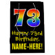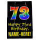 This fun, exciting, and colourful birthday-themed giftbag design features a large number "73" with a rainbow spectrum gradient inspired pattern, along with the message "Happy 73rd Birthday,", and a customizable recipient name. The background is coloured black. A gift bag like this might be used when wrapping gifts being given to somebody in celebration of their 73rd birthday. [~Z0000512]