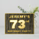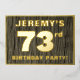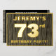 The front of this bold seventy-third birthday celebration foil invitation card features a custom name, a large number “73rd”, the message “BIRTHDAY PARTY!”, and a border, all in foil. There is a rustic, yet elegant, faux wood grain look inspired pattern for the background of the front. The back features personalized details about the event, such as the date, time, venue, and any other useful information. Customized invitations like these might be used to invite attendees to a birthday party/gathering being held to celebrate somebody’s 73rd birthday. [~Z0000598]