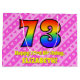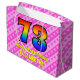 This cheerful and happy 73rd birthday-themed gift bag design features a large number "73" having a rainbow spectrum inspired gradient pattern. It also features the message "Happy 73rd Birthday,", followed by a personalized name. The background features a dark pink and light pink stripes pattern containing loving pink heart shapes. Gift bags like this might be used when wrapping presents or gifts being given in honour of somebody’s seventy third birthday. [~Z0000414]