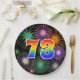 This cheerful, colourful, and fun paper plate design features a large number "73" containing a rainbow spectrum gradient inspired pattern colouring. It also features a vibrant and exciting bursting celebratory fireworks inspired pattern. The background is coloured black. Paper plates like this might be fun to use at a party being held to celebrate somebody’s 73rd birthday, an 73rd anniversary, or some other seventy-third event. [~Z0000490]