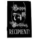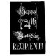 This elaborate and opulent birthday themed giftbag design features the message “Happy 74th Birthday,” in ornate script style text, on a black coloured background. It also features a personalized recipient name. An elegant birthday themed gift bag like this might be a respectable way to wrap a gift or present being given to celebrate somebody’s seventy fourth birthday. [~Z0000557]