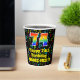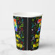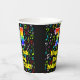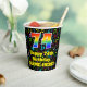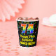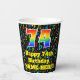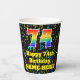 This cheerful and exciting music themed birthday paper cup design features a large number “74” with a rainbow spectrum gradient inspired pattern, along with the message “Happy 74th Birthday,”, and a customizable name. The background features a colourful pattern having music notes and symbols of various sizes and colours. Colourful, vibrant paper cups like this might be fun to use at a birthday party being held to celebrate somebody’s 74th birthday. [~Z0000541]