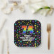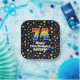 This cheerful and vibrant birthday paper plate design features a large number “74” with a rainbow spectrum gradient inspired pattern, along with the message “Happy 74th Birthday,”, and a personalized name. The background features an exciting and colourful star field inspired pattern. Paper plates like this might be used at a party held in celebration of somebody’s seventy fourth birthday. [~Z0000582]