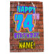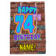 The front of this fun birthday gift bag design features the message “HAPPY 74TH BIRTHDAY,” having a colourful, vibrant, graffiti-inspired look, in addition to a custom recipient name. The background features a pattern inspired by the look of a brick wall. A birthday themed gift bag like this might be a fun way to wrap a gift or present being given to celebrate somebody’s 74th birthday. [~Z0000536]