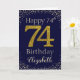 Happy Birthday with simulated golden glitter number 74 set on dark purple blue and framed by faux diamonds and rhinestones. Happy birthday and recipients name in off-white font. Personalize with name or message.