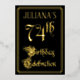The front of this ornate, elegant, foil seventy-fourth birthday party/celebration invitation design features the message “74th Birthday Celebration” in luxurious script-style text. It also features a custom name. The background of the front is coloured black by default (although it can be customized to a different colour). The back features personalized details about the event, such as the date, time, location, and any other relevant information. Luxurious, opulent, customizable invitations like these might be used to invite guests to a birthday celebration/party being held to honour somebody’s seventy-fourth birthday. [~Z0000589]