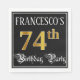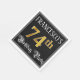 This elegant and ornate birthday themed paper napkin design features an editable name and the message “74th Birthday Party”. The large number “74th” has a faux/imitation gold-inspired colouring pattern, the words “Birthday Party” are in opulent script-style text, and the background is coloured black by default (although it can be customized). Luxurious, opulent paper napkins like this might be useful to have at a birthday celebration being held to honour somebody’s seventy fourth birthday. [~Z0000565]