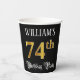 This fancy and luxurious birthday themed paper cup design features a customizable name and the message “74th Birthday Party”. The large number “74th” has an imitation/faux gold-inspired colouring pattern, and the words “Birthday Party” are in ornate script-style text. The background is coloured black by default (although it can be customized). Opulent, ornate paper cups like this might be used at a birthday celebration being held to honour somebody’s 74th birthday. [~Z0000567]